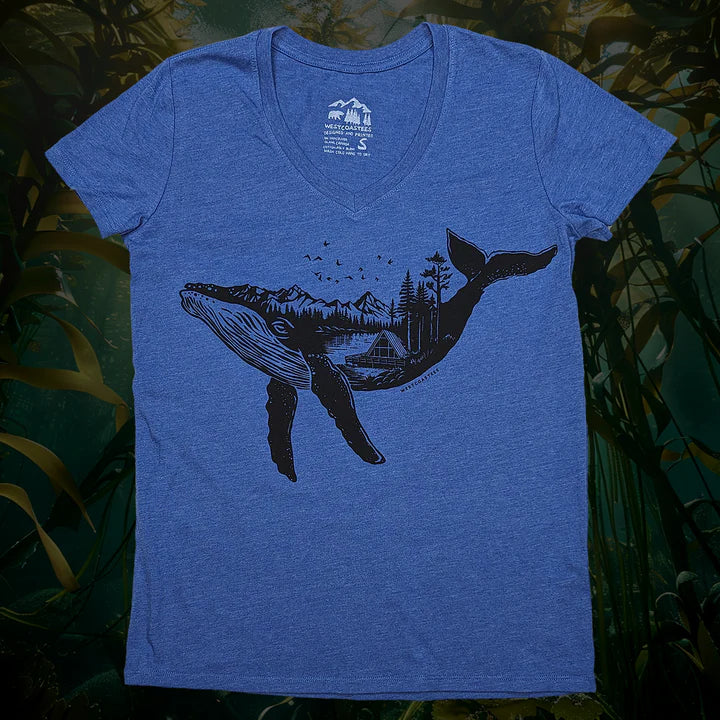A majestic Cabin in the woods, on top of a whale! Printed on a Poly-Cotton (50% Polyester / 50% Combed-Cotton) T-shirt. Unlike other Poly-Cotton T-shirts, our shirts are made with combed cotton, giving it a soft, worn in feel, superior drape, excellent colour fastness and durability throughout multiple washes.