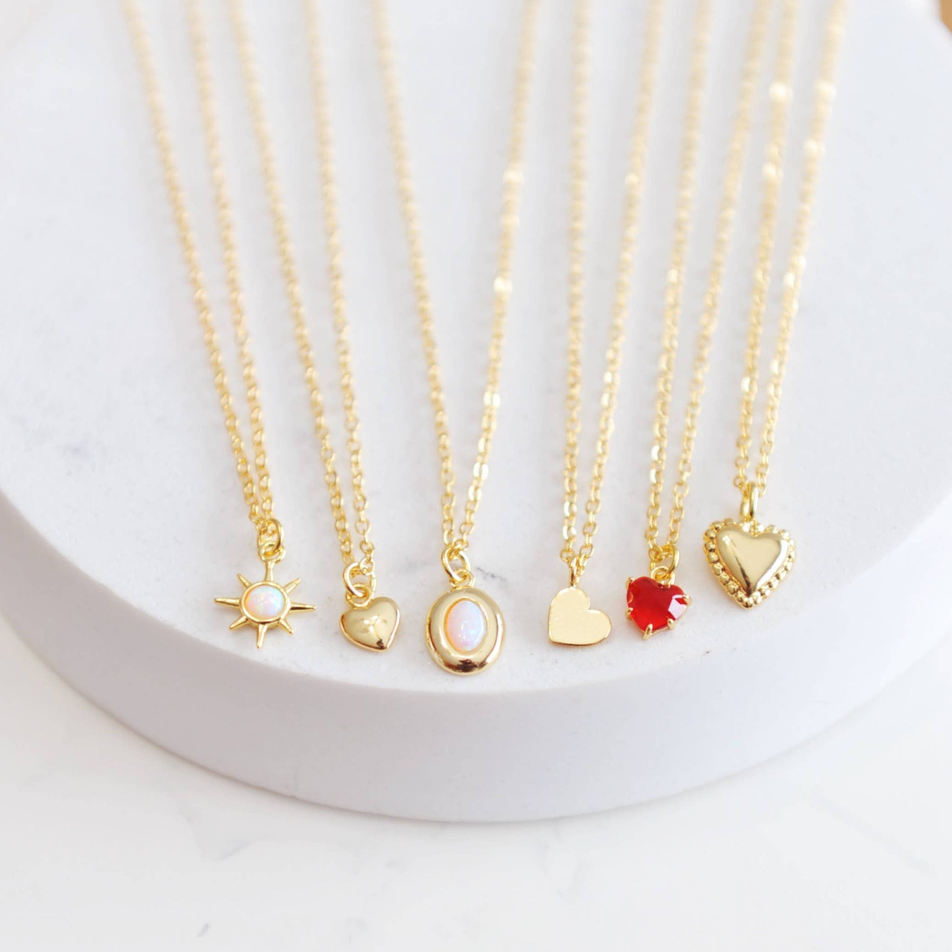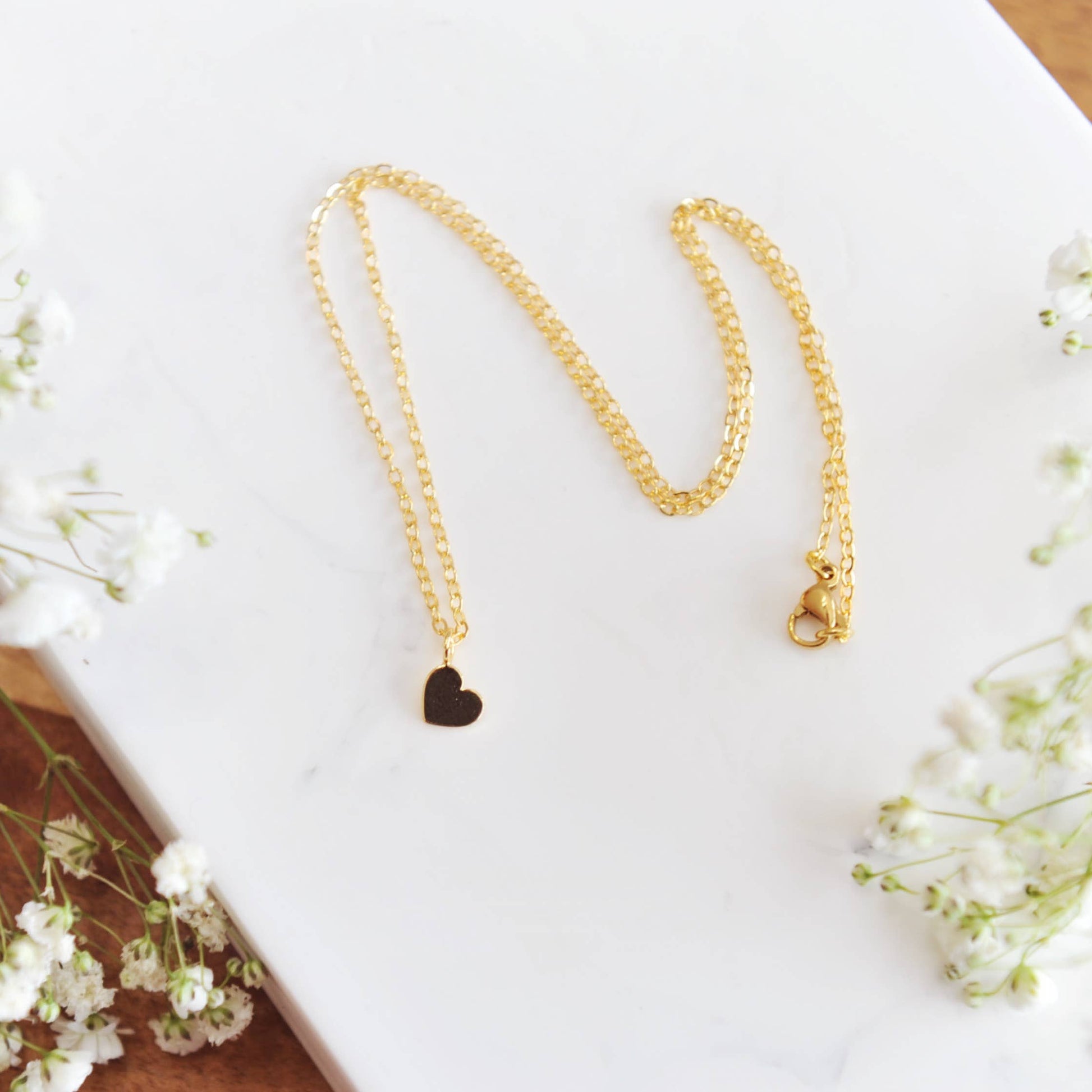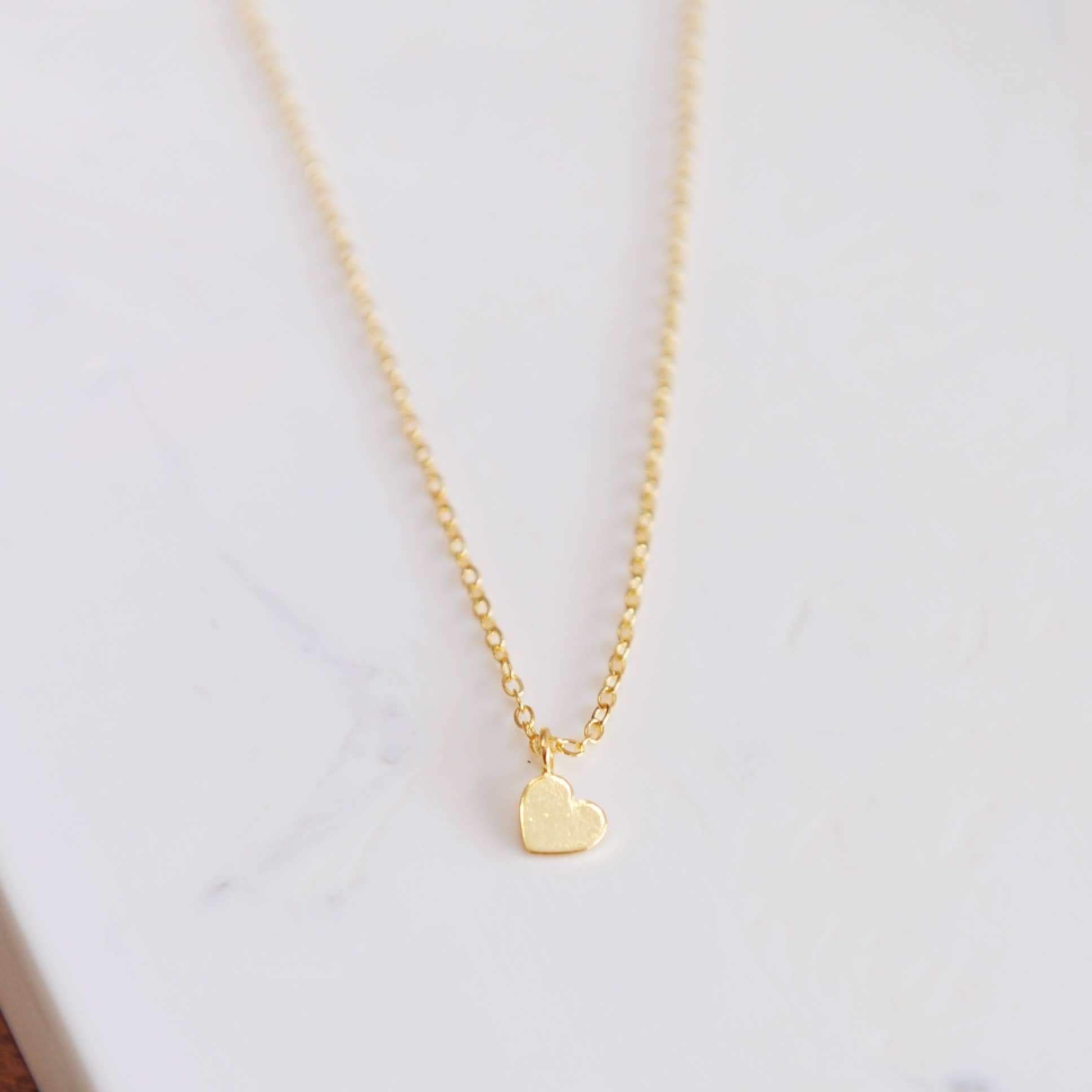 Dainty dangle heart charm upon 18" 16k gold plated brass chain.