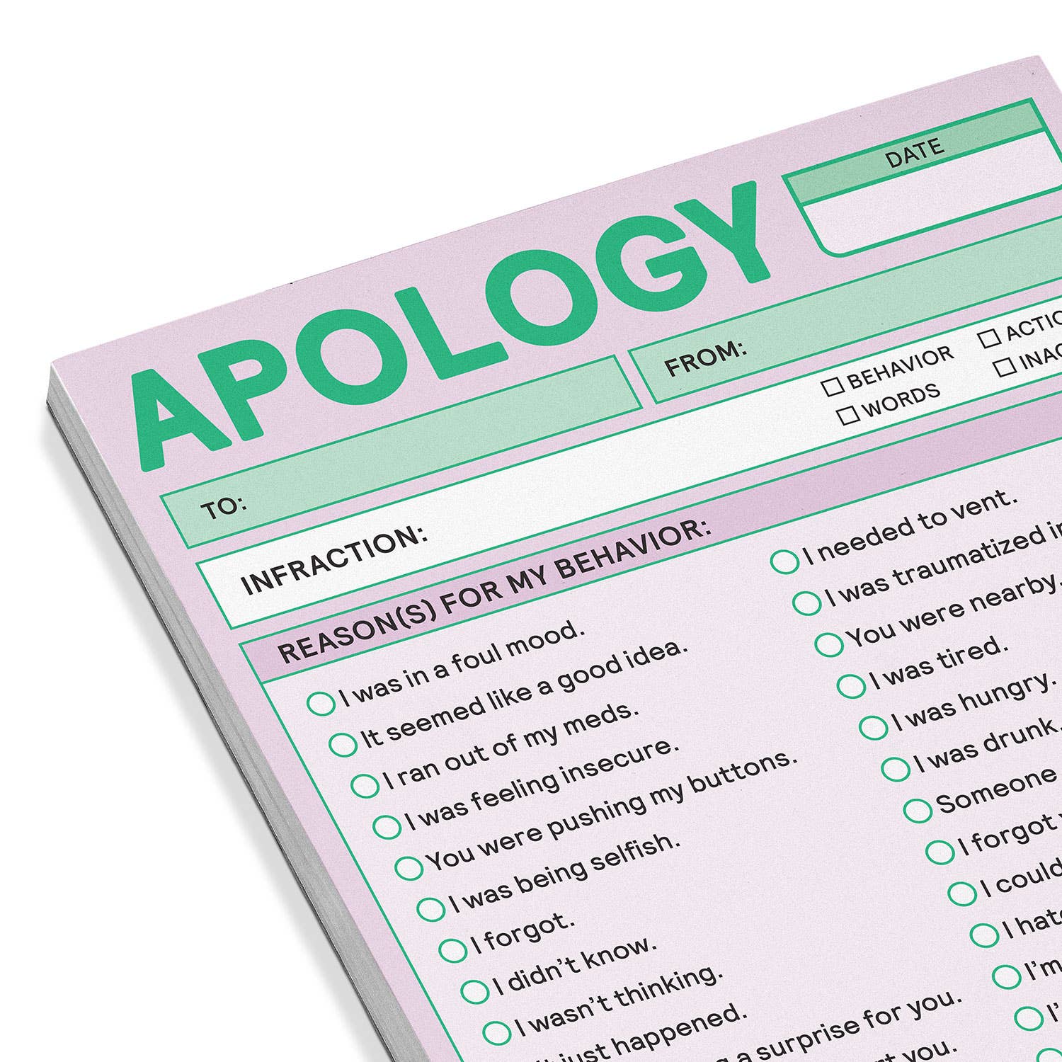 Defuse conflicts and avoid the humbling, awkward act of actually “saying” I’m sorry with this handy paper workaround. Just fill in the blanks, hand it over—and hey presto, problem solved!