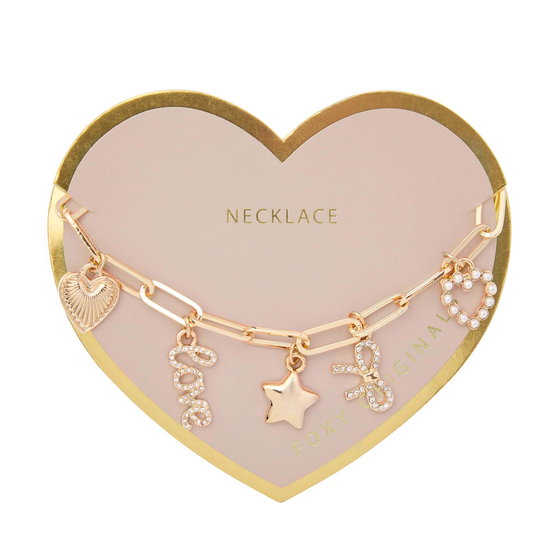Style meets charm with the Bella Charm Necklace. Featuring 5 beautiful charms: a heart, a star, a pavet-studded bow, a pavet-studded 'love' charm, and a glass pearl heart.