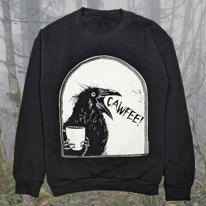 Cawfee is printed on a 70/30 combed ring-spun cotton/recycled polyester fleece crewneck sweater made of 12.7 oz/L yd fleece fabric featuring baby ribbed neckband, waistband and sleeve cuffs.