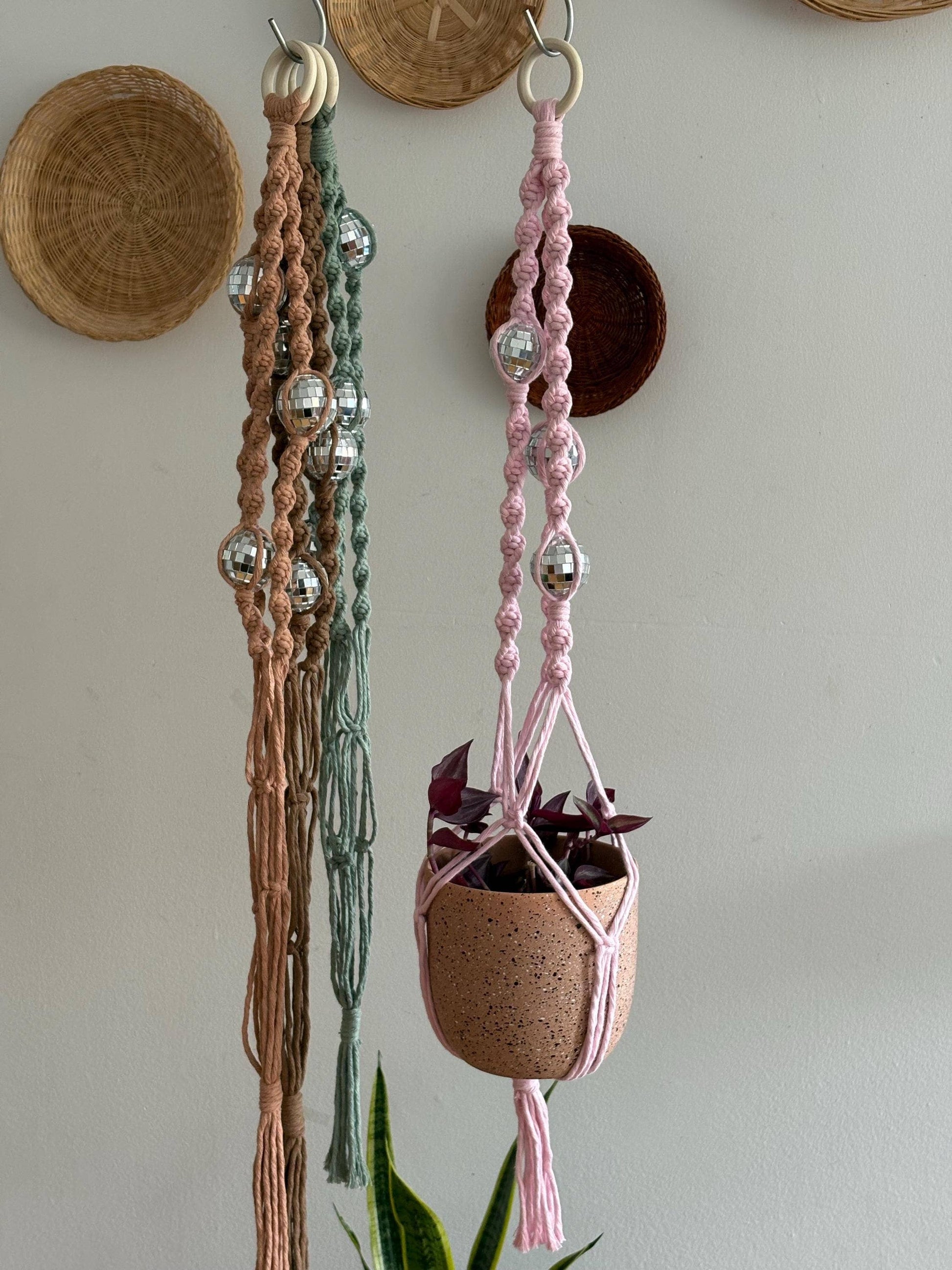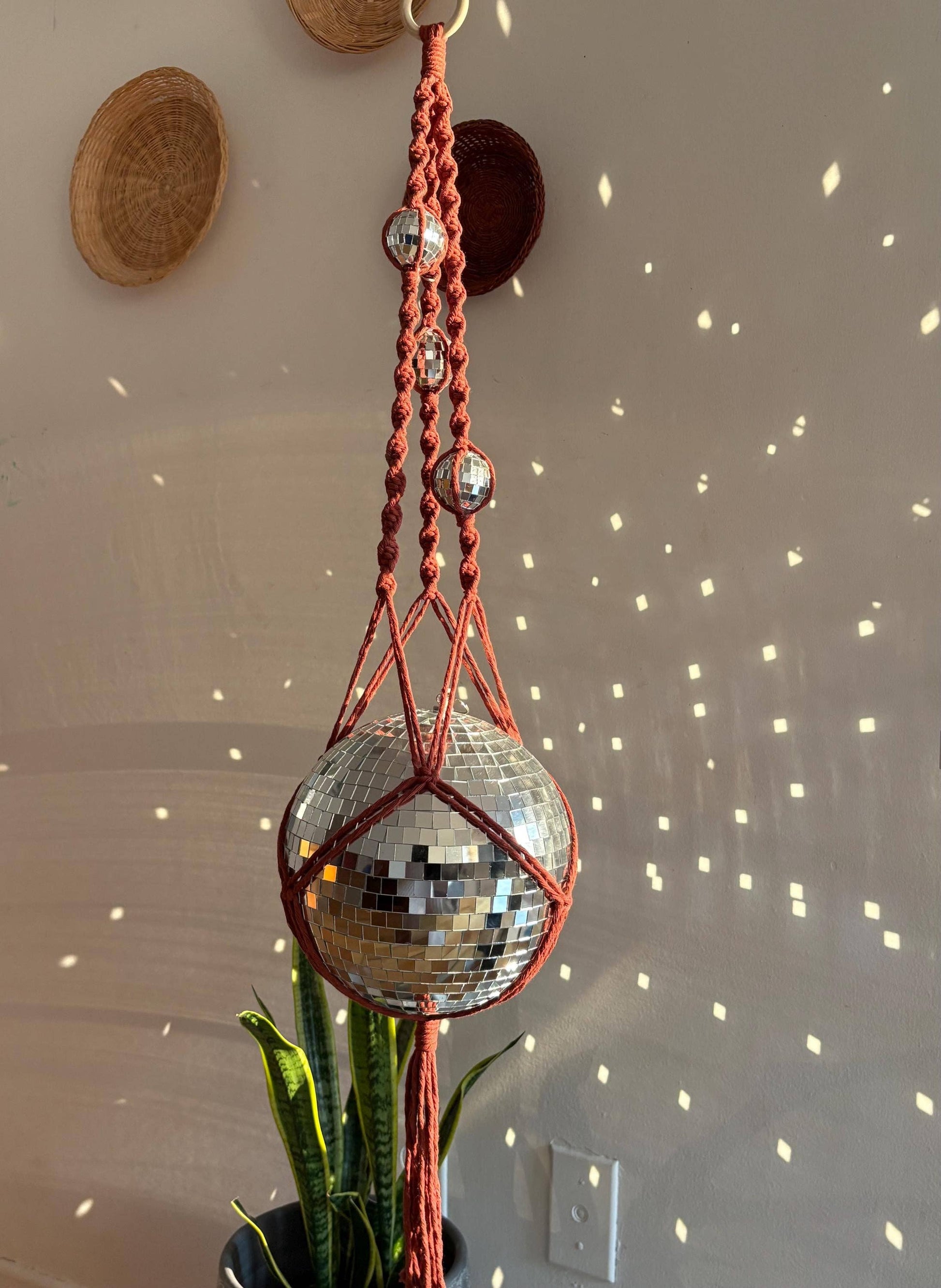 A shimmering disco ball becomes a stylish plant hanger—watch as sunlight fractures into rainbows across your walls in vibrant, boho-chic style. Handmade macramé detailing and mirrored shine bring retro flair and modern whimsy to any space.