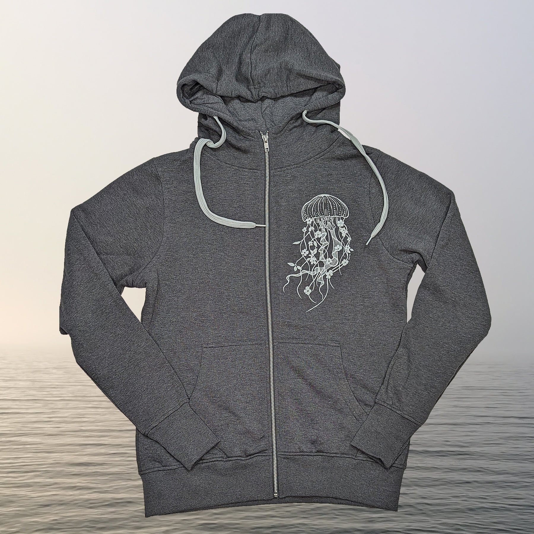 Dogwood Jelly is printed on a 15.7-oz, heavy, cozy and warm cotton/polyester fleece. 75/25% made with combed and ring spun cotton featuring 100% cotton jersey lined hood with contrast drawstring and thumbholes at cuffs.