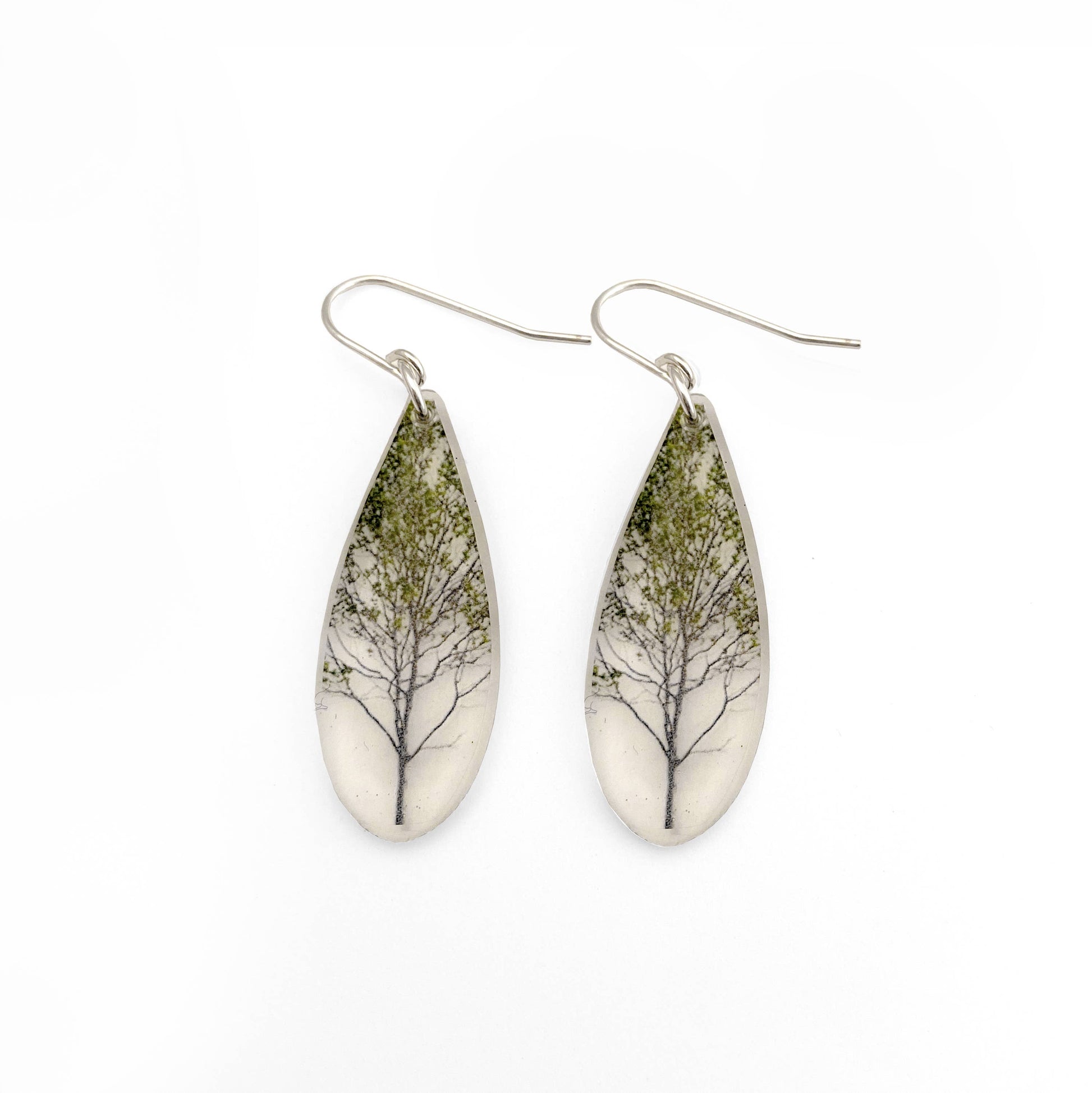 Clear photo earrings handmade with acrylic, resin and a photograph of a green tree. 1-1/4" tall, 1/8" thick. Sterling silver ear wires. These earrings are clear so whatever is behind the earrings will be the background of the image, making them quite subtle from certain angles. There is an additional photo of similar earrings being worn as well as a photo of the earrings as they come, packaged.