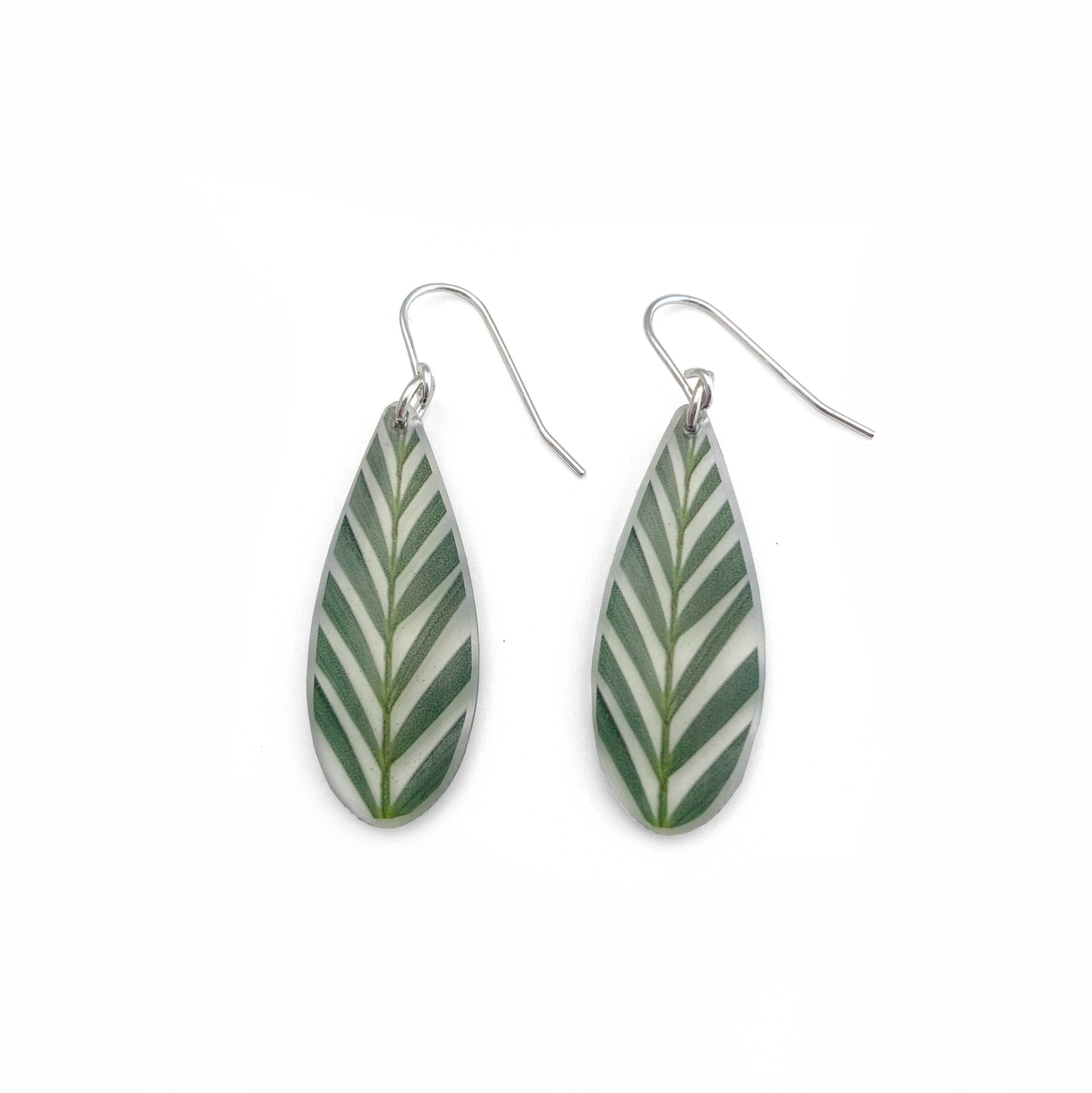 Clear photo earrings handmade with acrylic, resin and a photograph of a green palm leaf. 1-1/4" tall, 1/8" thick. Sterling silver ear wires. These earrings are clear so whatever is behind the earrings will be the background of the image, making them quite subtle from certain angles. There is an additional photo of similar earrings being worn as well as a photo of the earrings as they come, packaged.