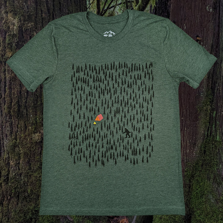 Beware of the thirsty Sasquatch, he is looking for drinks and a warm place to sleep. Forest camping is printed on a Poly-Cotton (50% Polyester / 50% Combed-Cotton) T-shirt. Unlike other Poly-Cotton T-shirts, our shirts are made with combed cotton, giving it a soft, worn in feel, superior drape, excellent colour fastness and durability throughout multiple washes.