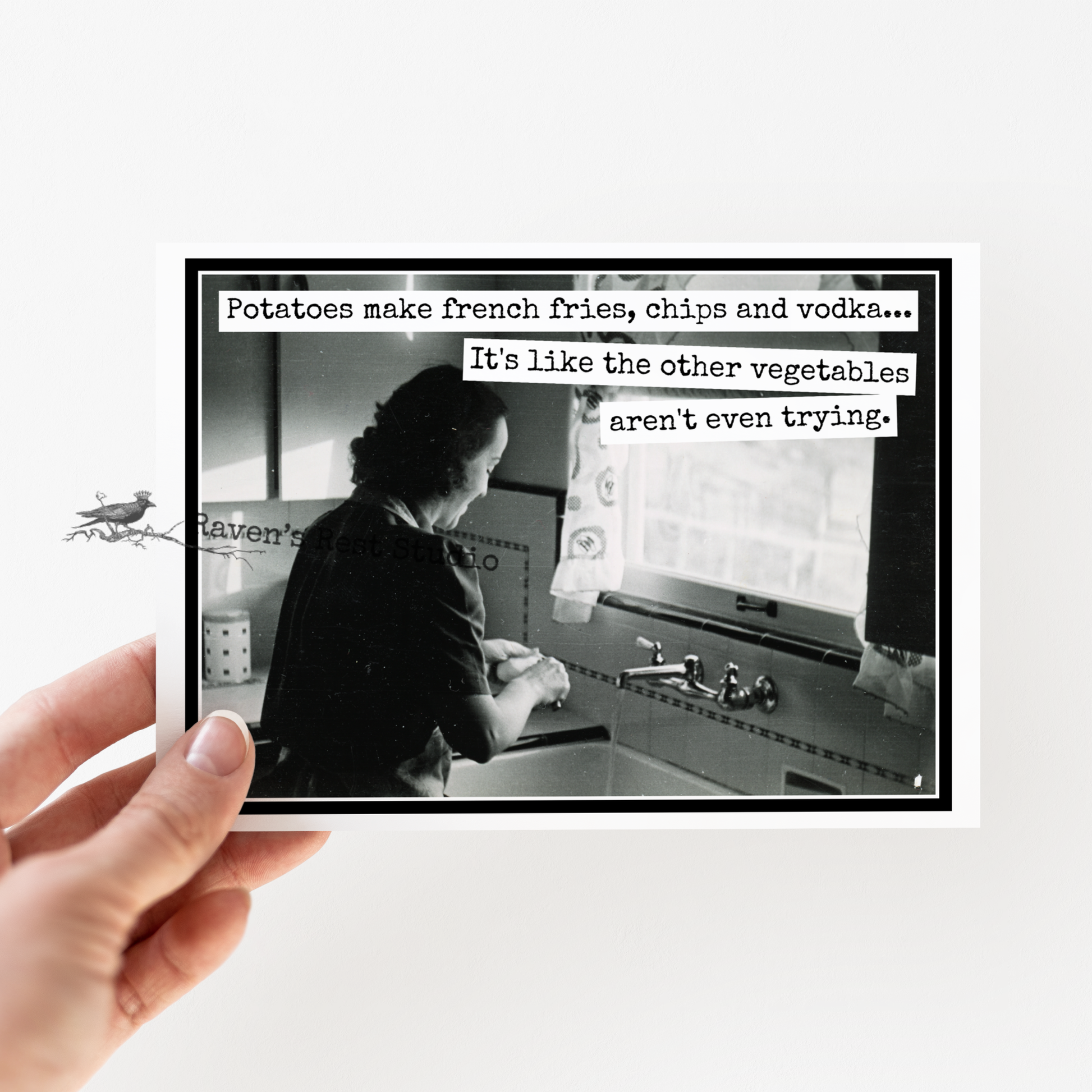 Funny Greeting Card. Potatoes, French Fries, Chips, Vodka.