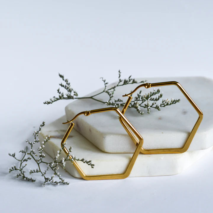 Elevate your style with our Hexagon Hoop Earrings. These bold, statement-making earrings are secure and made with high-quality gold ion plated stainless steel, ensuring they work with any outfit. Make a statement with our Hexagon Hoop Earrings and stand out from the crowd!