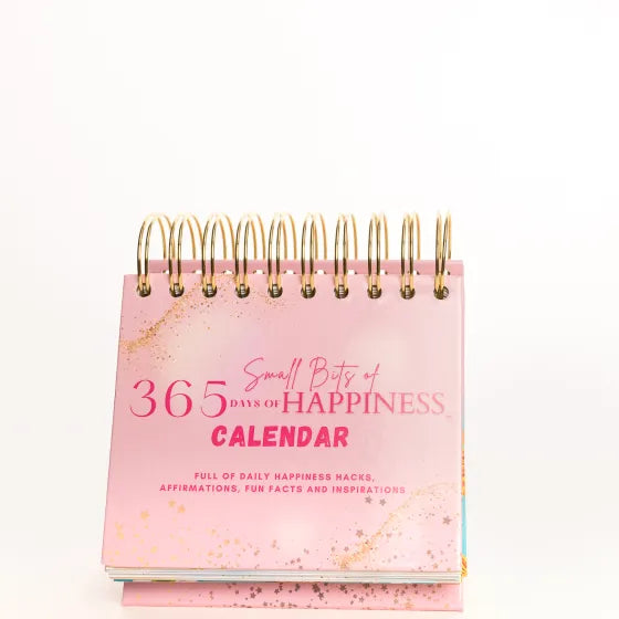 365 Days of Happiness is a calendar created and designed by teens for everyone, to find small bits of happiness in everyday. This calendar features 365 small bits of happiness, including happiness activities, quotes, fun facts, and personal affirmations. This calendar is unique as it can be re-used year after year. Find a small bit of happiness in everyday by finding the date and small bit of the day, with a family member, child, partner, or on your own.
