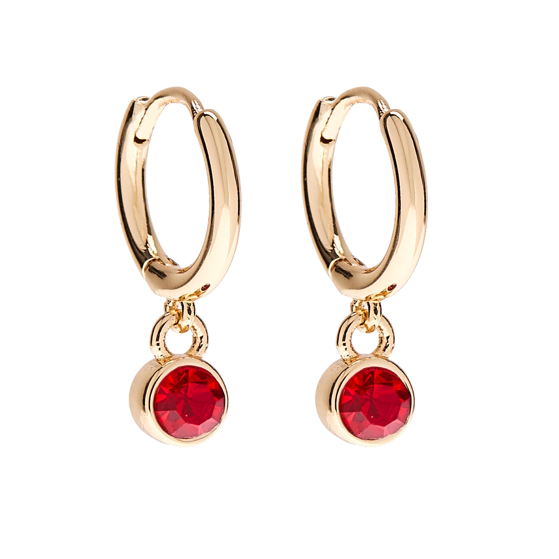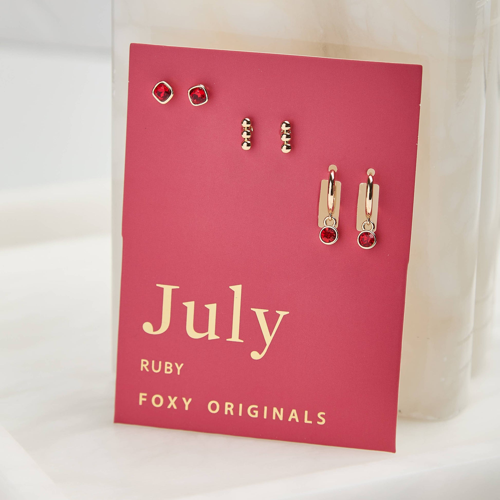 The Birthstone collection lets you individualize your everyday style with a set of earrings you can mix and match for any occasion. The July Birthstone Earrings showcase delicate huggie hoops with a dangling ruby-toned stone that represents vitality, matching cushion stone studs, and a gold plated triple dot bar.