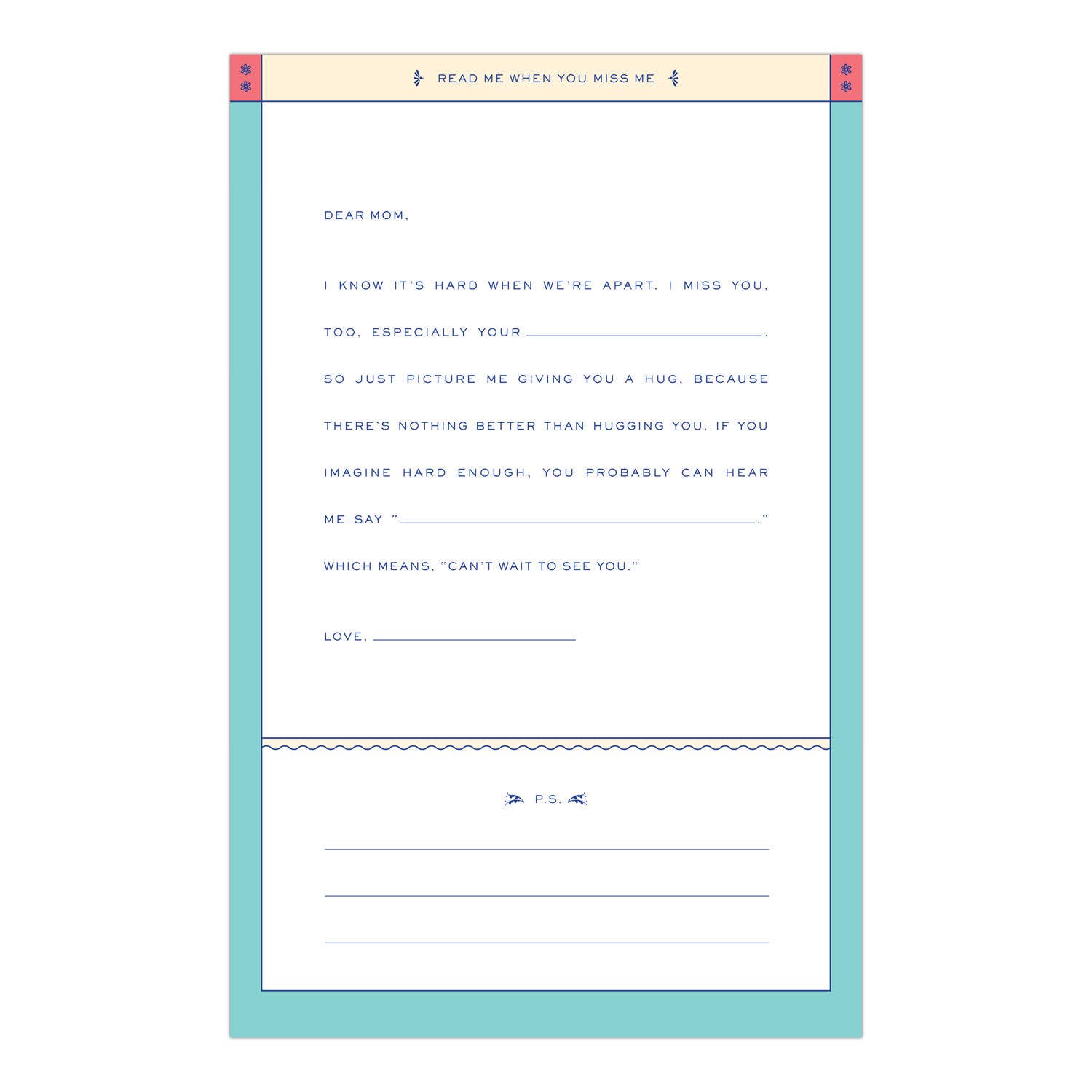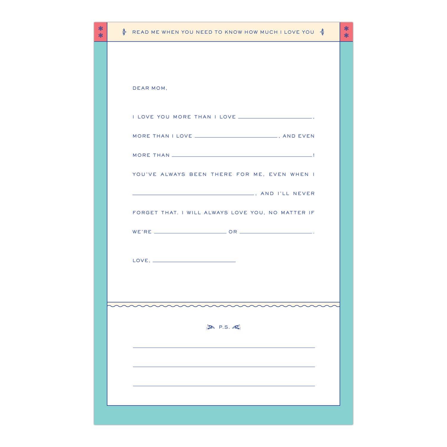 Perfect for Mother's Day! Create a treasure trove of letters for your favorite mom. Simply fill in the blanks on eight situation-specific missives, seal them in their corresponding envelopes, and present the whole package in its keepsake box. The letters can then be opened at just the right moment in the future to provide your personal thoughts and encouragement. Gift ideas for mom that'll make her cry (in a good way) Includes scenarios like "Read me when you need to know how much I love you" and "Read me when you miss me" 7.25 x 4 inches; 9 cards and envelopes
