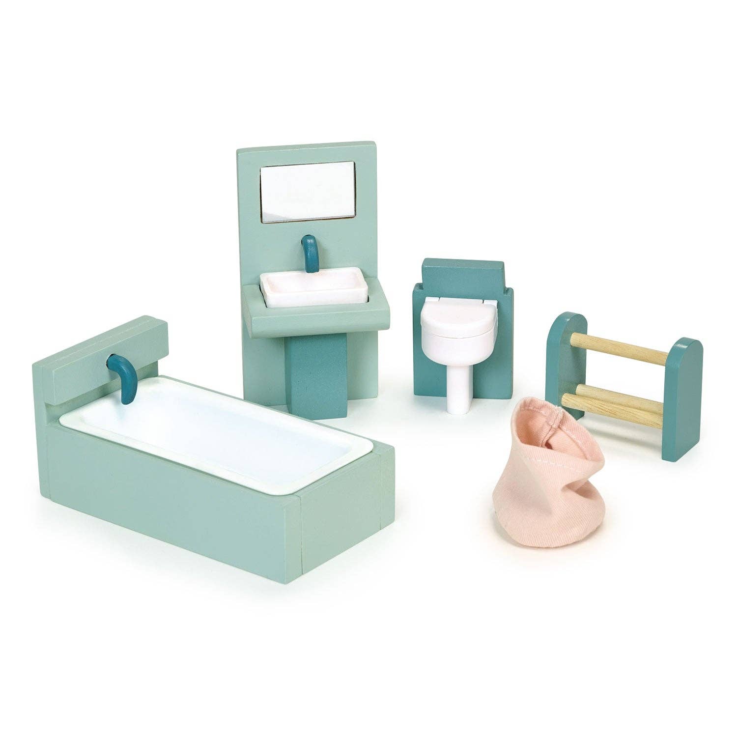 This wooden doll's house furniture set includes a toilet, a bath, a sink unit with mirror, a towel stand, a fabric laundry basket.