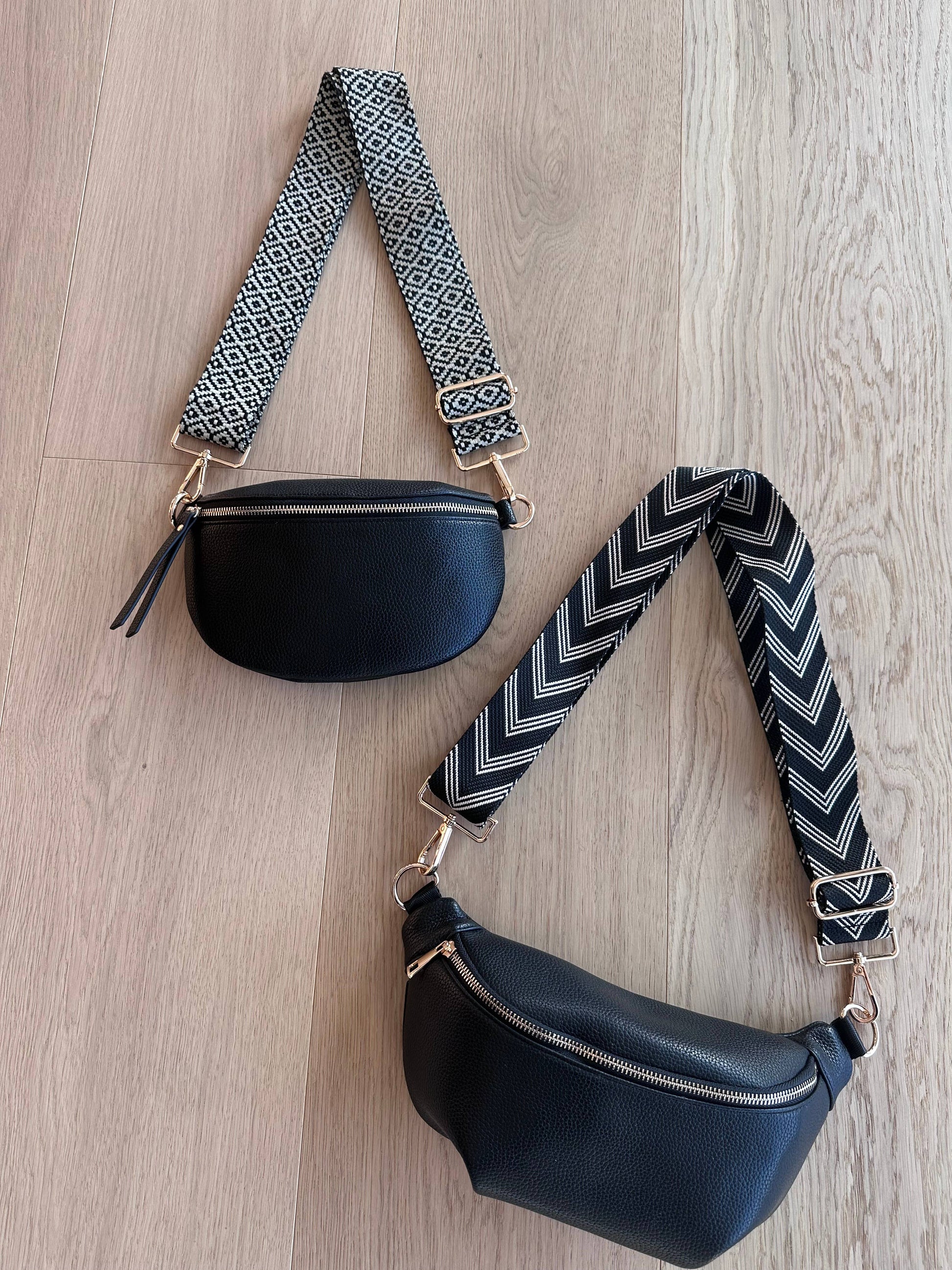 This bag comes with a black PU vegan leather strap. If you would like a patterned strap, please purchase it separately.