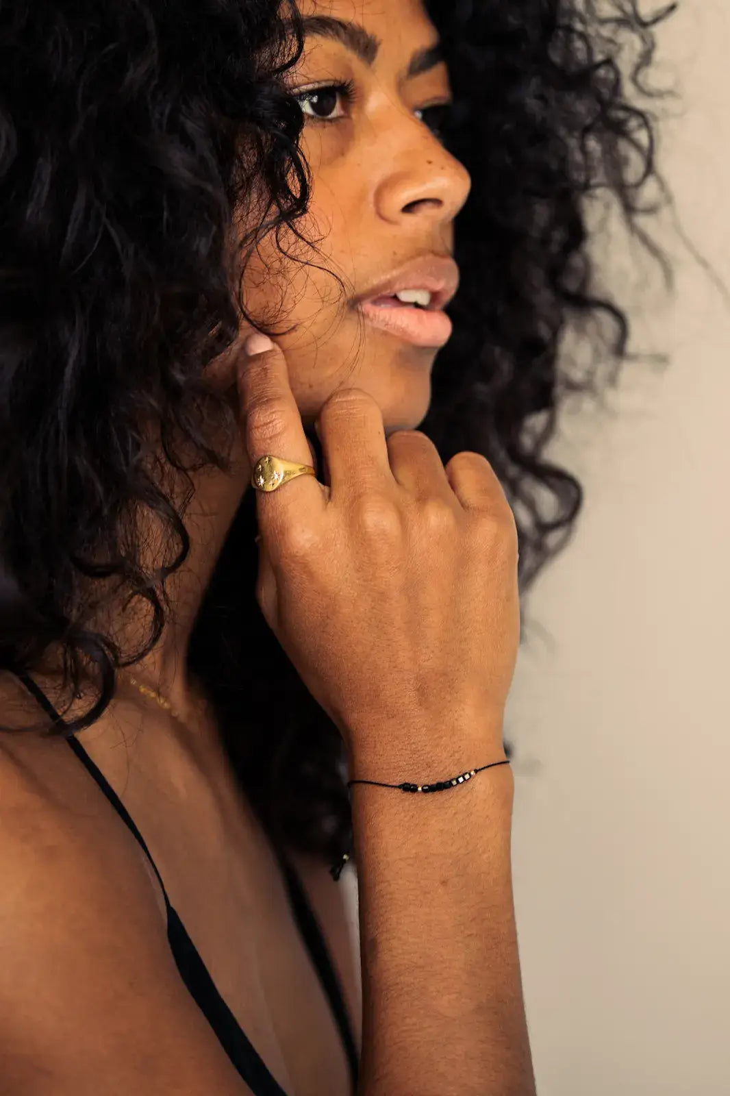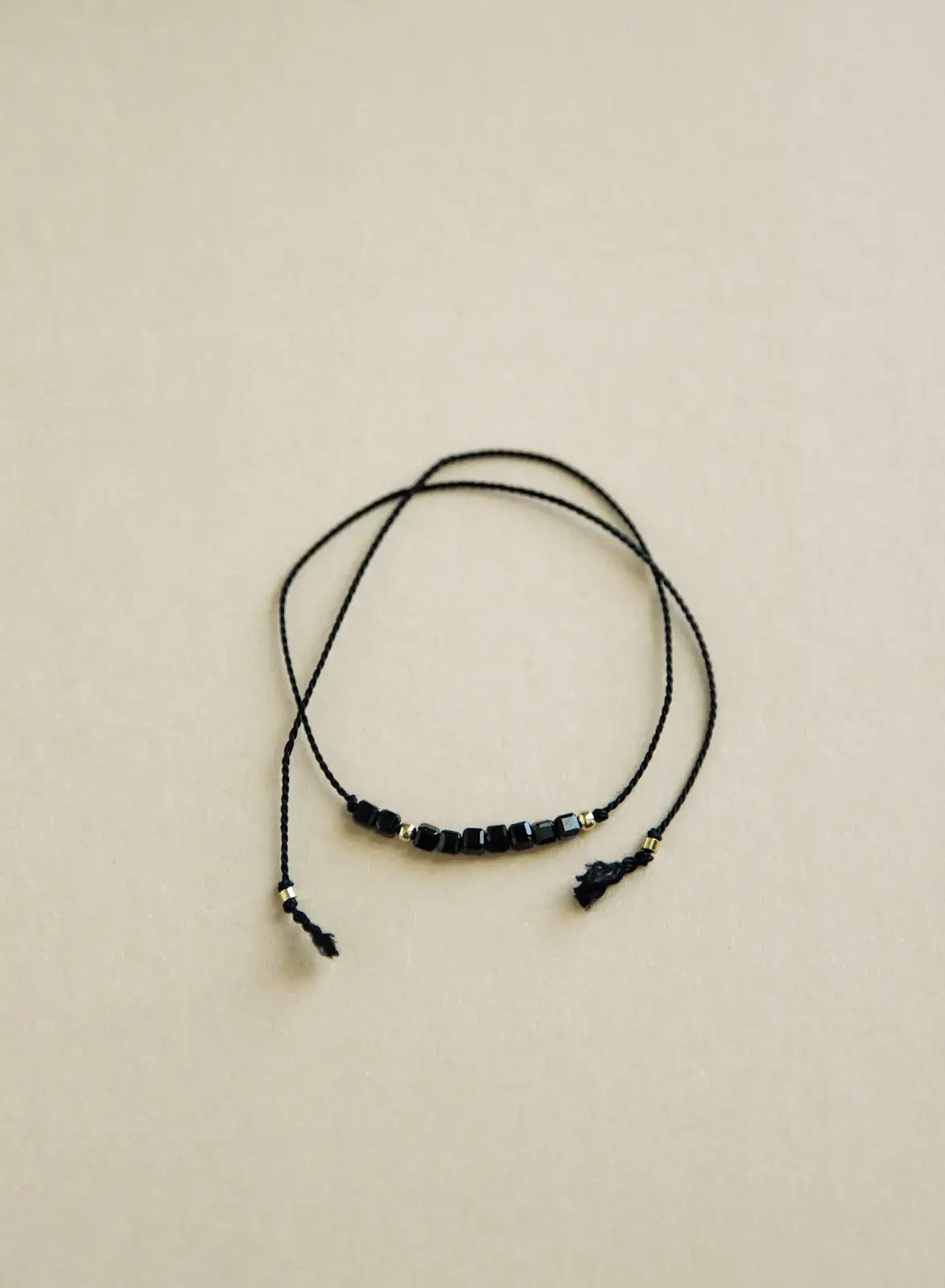 Beautiful, dainty and minimalistic string bracelet made from 100% silk string and 2-3mm cube Kyanite and Moonstone gemstones and 14K gold. 11 crystals in total.