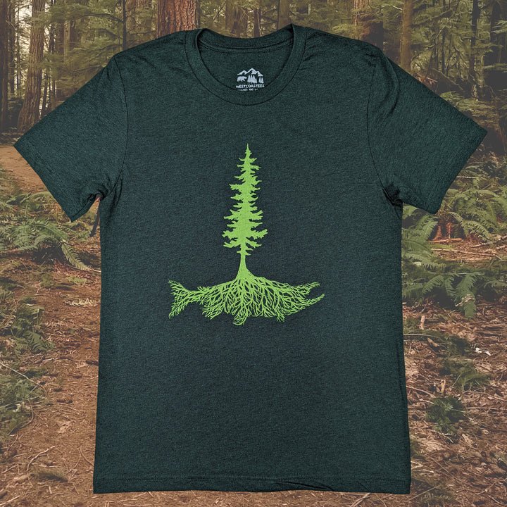 Depicting the natural life cycle of a Vancouver Island forest. Salmon Roots design is printed on soft and comfortable cotton poly blend tee. Unlike other Poly-Cotton T-shirts, our shirts are made with combed cotton, giving it a soft, worn in feel, superior drape, excellent colour fastness and durability throughout multiple washes.