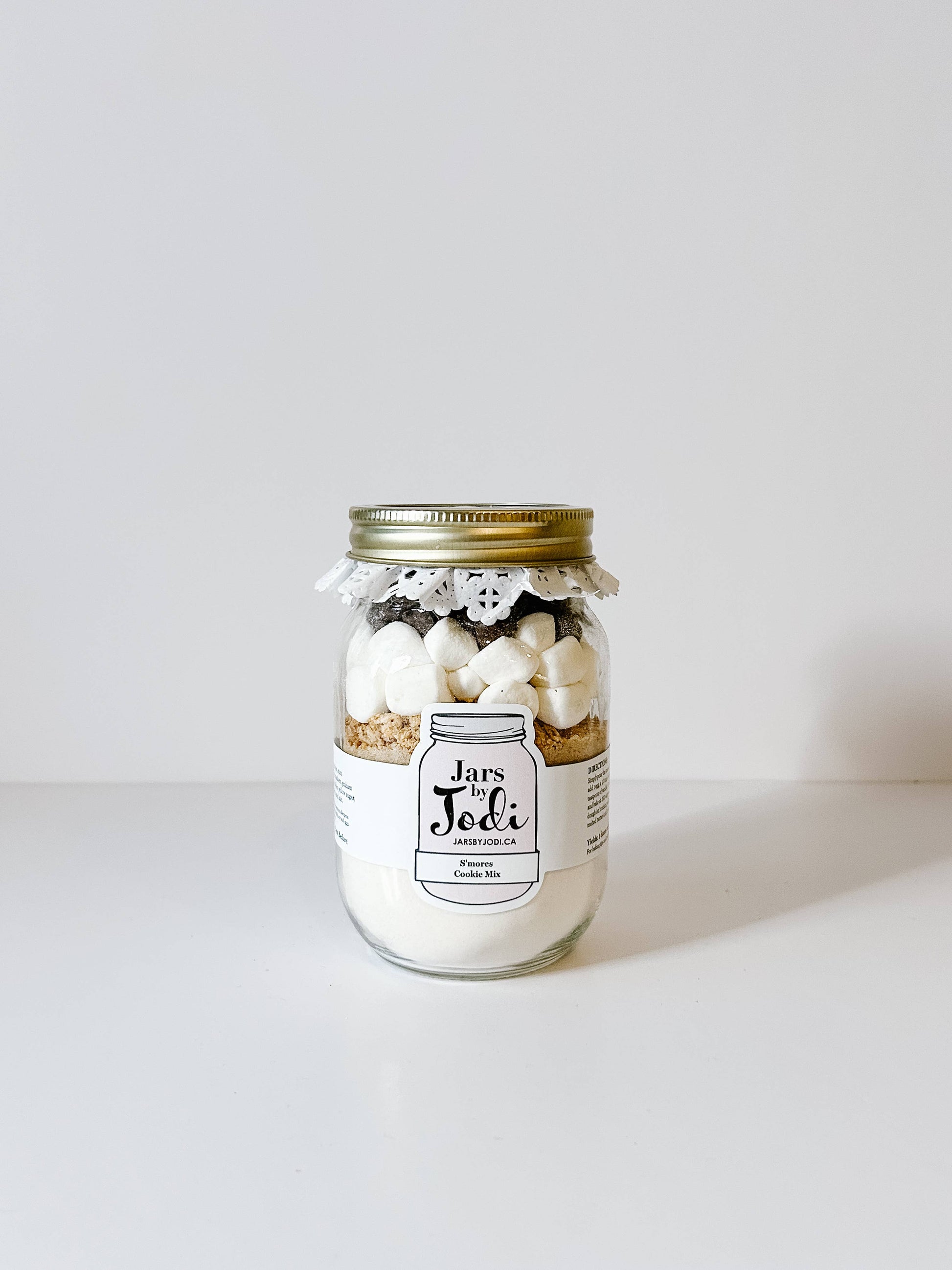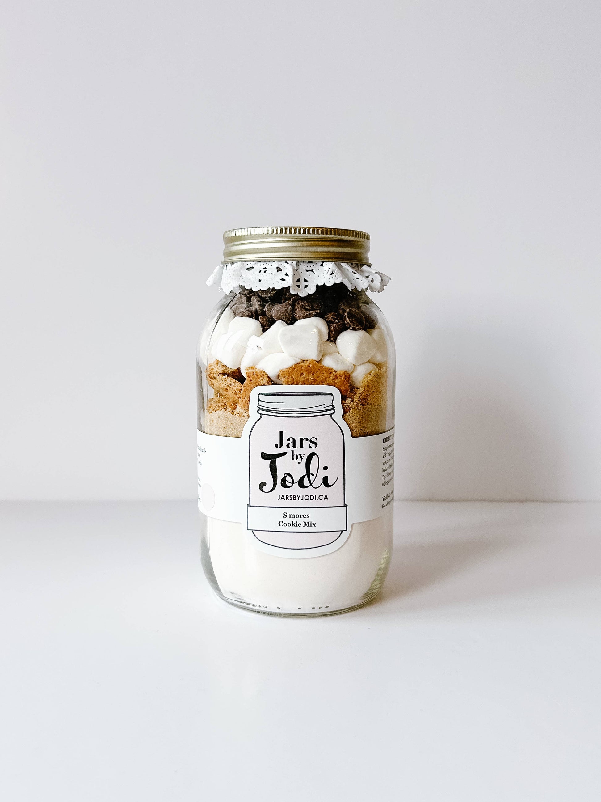 All the baking ingredients to make S'mores Cookies. Simply pour the mason jar mix into a bowl and add egg, slightly melted butter, and vanilla, according to the directions on the label. Combine and bake at 350 degrees for 7-10 minutes.