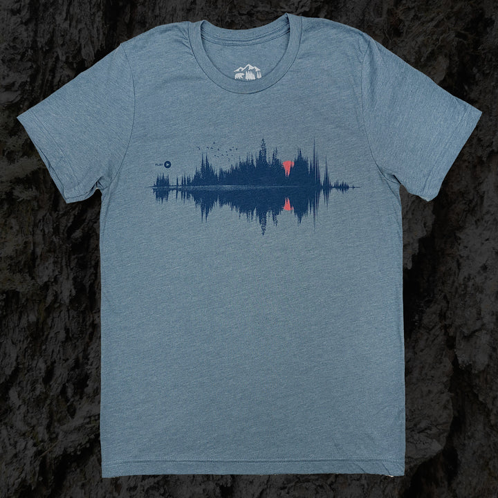 A bright red sun piercing through trees that cast a refection of a sound-wave. Soundwave is printed on a Poly-Cotton (50% Polyester / 50% Combed-Cotton) T-shirt. Unlike other Poly-Cotton T-shirts, our shirts are made with combed cotton, giving it a soft, worn in feel, superior drape, excellent colour fastness and durability throughout multiple washes. Our T-shirt has a tailored regular fit.