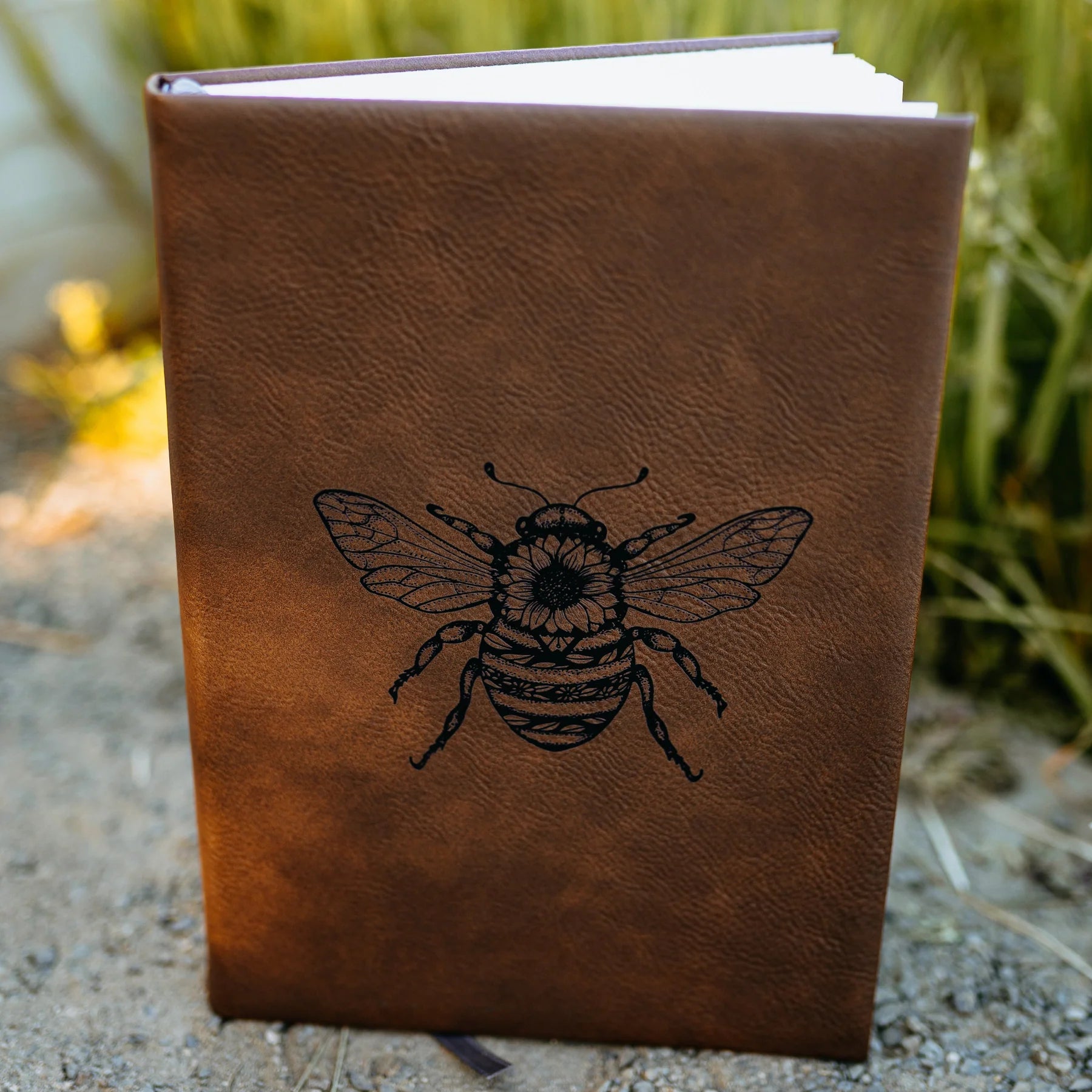 The Sunflower Bee journal is perfect for writers, foragers or those who love to journal. Locally engraved with a laser which won't fade or scratch away. It has the look and feel of genuine leather but this synthetic material resists water spots, cleans easily and is durable enough for daily use. Lined pages and a satin ribbon bookmark.