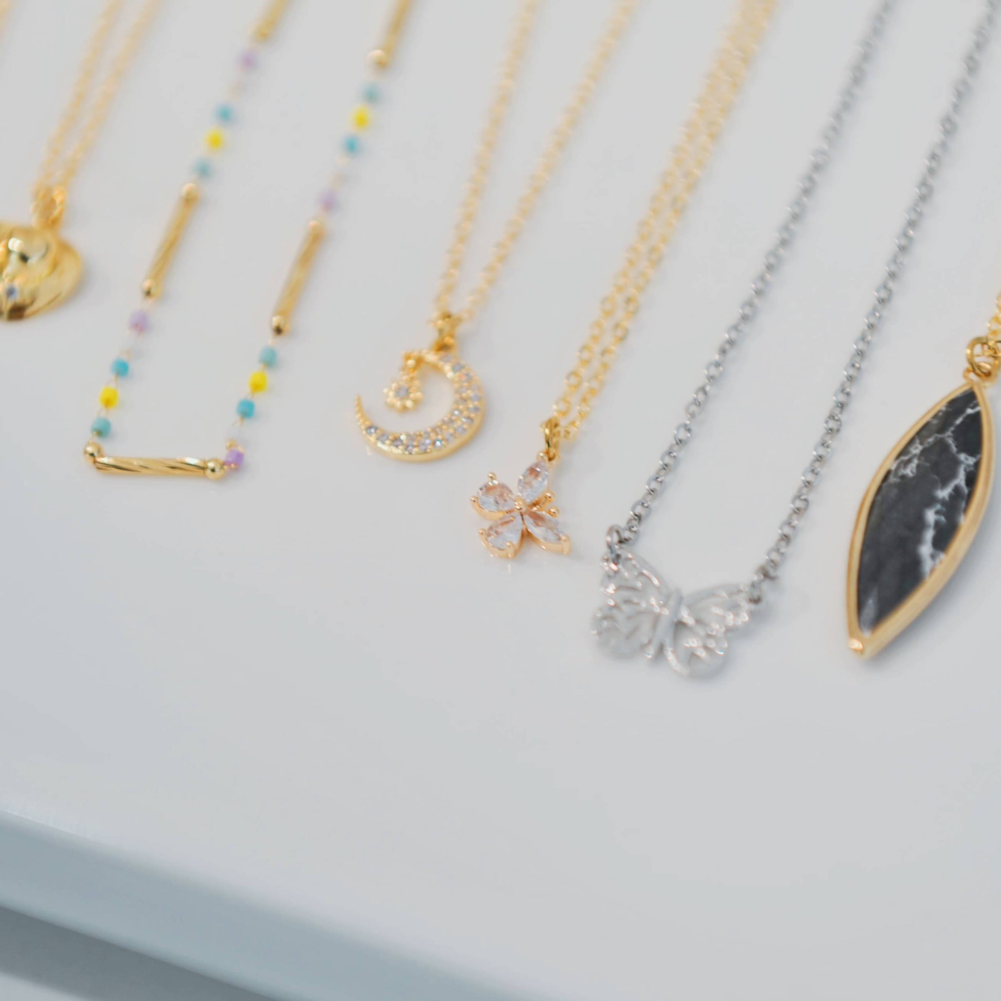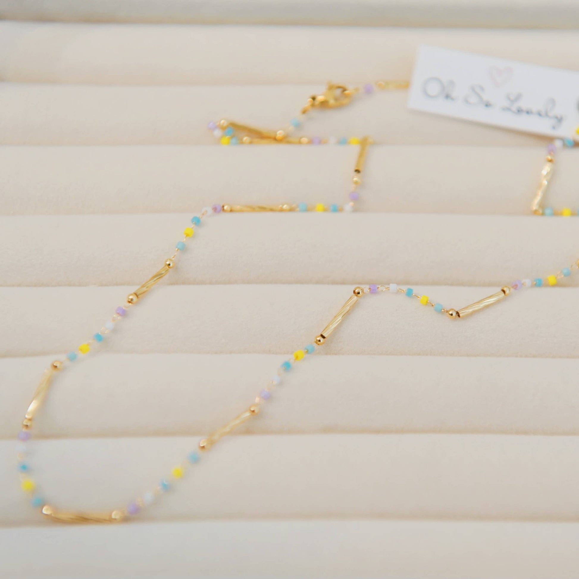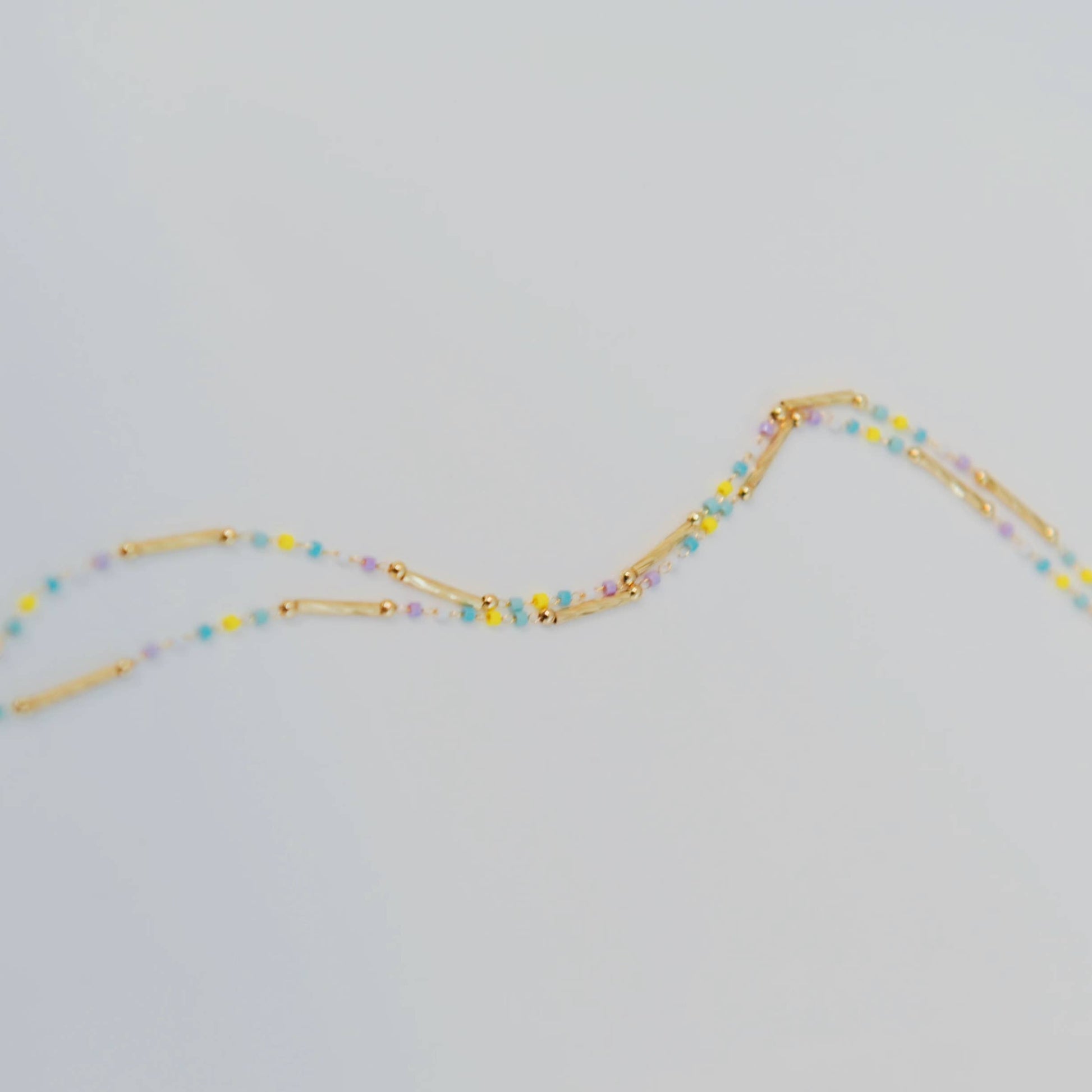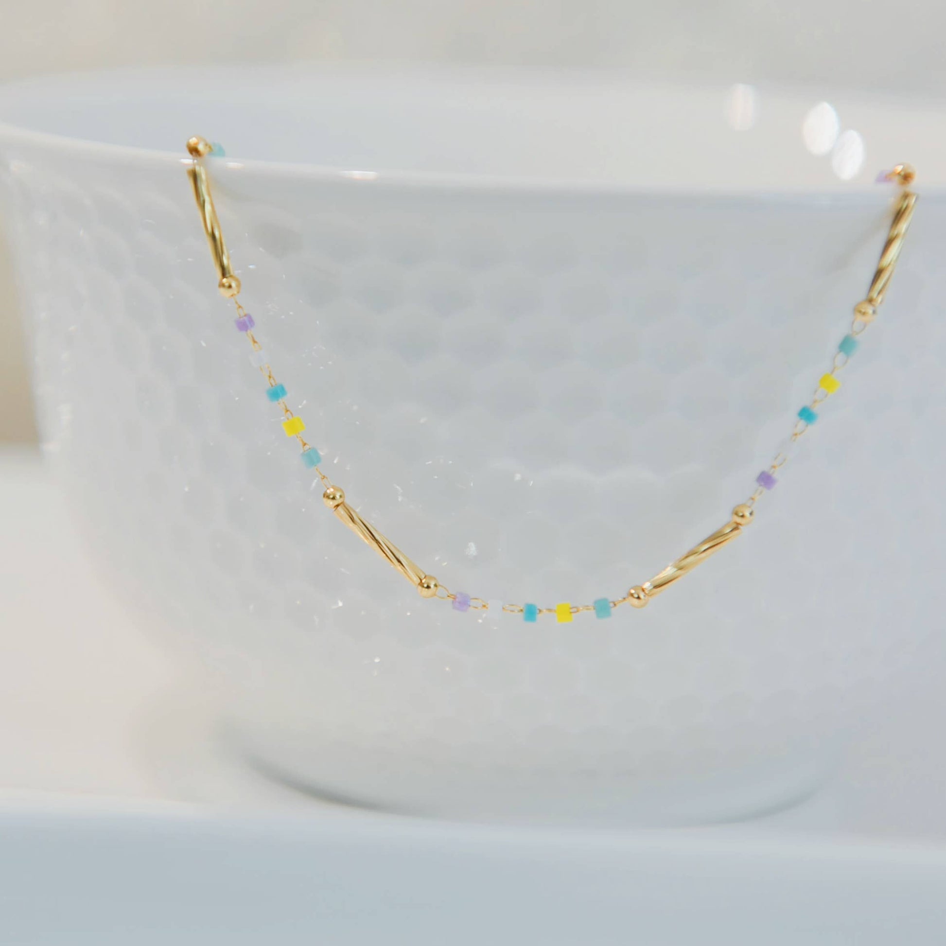 Tiana chain features colored beads mixed with 14 k gold plated brass pieces.